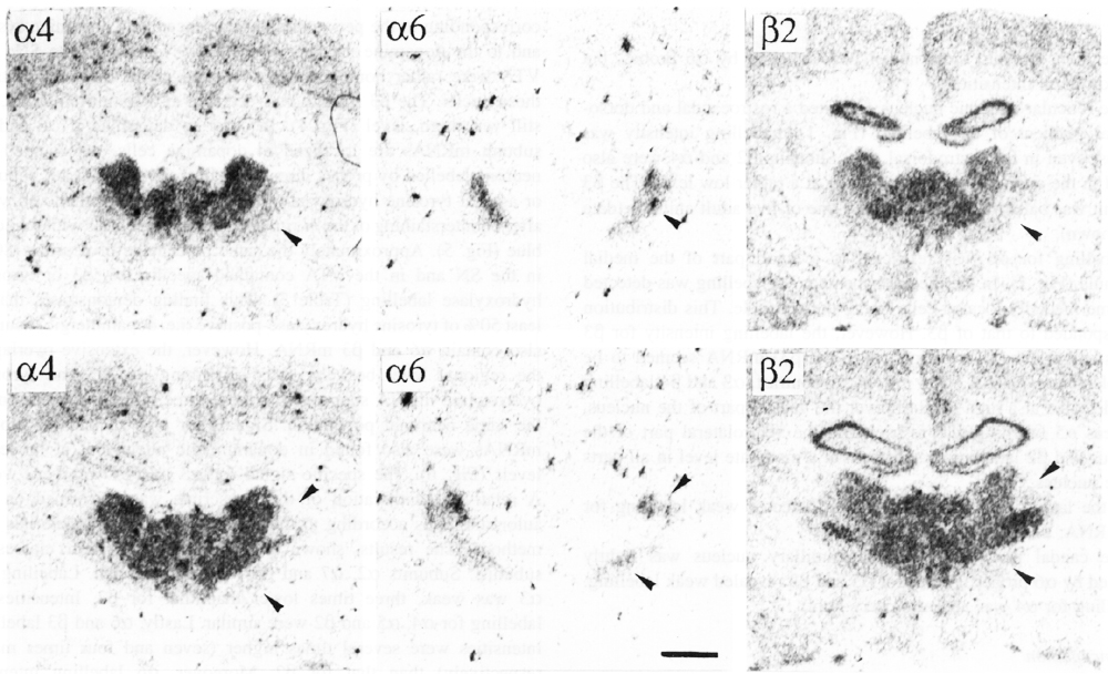 Clarke and Pert (1985) clearly showed the existence of receptors with high affinity for nicotine in the mesencephalic dopamine soma, as well as in the striatal dopaminergic terminals. Picciotto et al. (1995) demonstrated that inactivation of the b2 subunit gene results in the complete disappearance of receptors with high affinity for nicotine. At least some nAChRs on the dopamine soma and terminals are then likely to contain b2. Moreover b4 mRNA was not detected in dopaminergic cells (Duvoisin et al. 1989, Dineley-Miller and Patrick 1992; and results presented here).