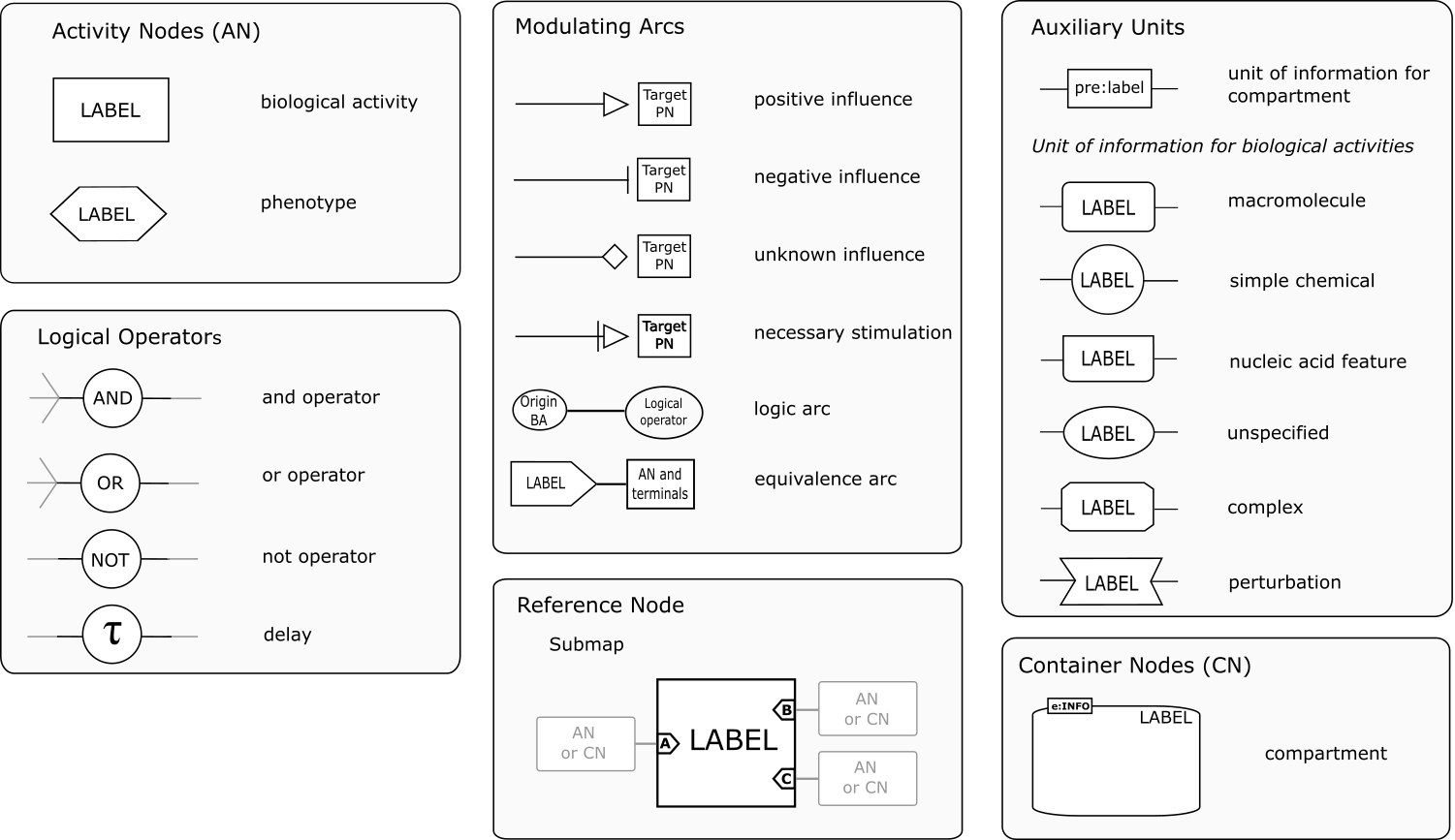 The Process Description language is made up of two different types of nodes (PDs are bipartite graphs) representing pools of physical entities ("continuants") and processes ("occurants", e.g., reactions. The arcs linking the nodes represent consumption, production, and modulation. Nodes can be adorned with states. This language allows a very detailed description of all the processes taking place in a system. However, it is subjected to combinatorial explosion. Process Descriptions are often used in most metabolic networks (e.g. Reactome, KEGG Pathways metabolic pathways, etc.). They are good graphical representations of process modelling, e.g. ODEs or stochastic processes. SBGN PD glyphs are summarised in the reference card: Also available in SVG