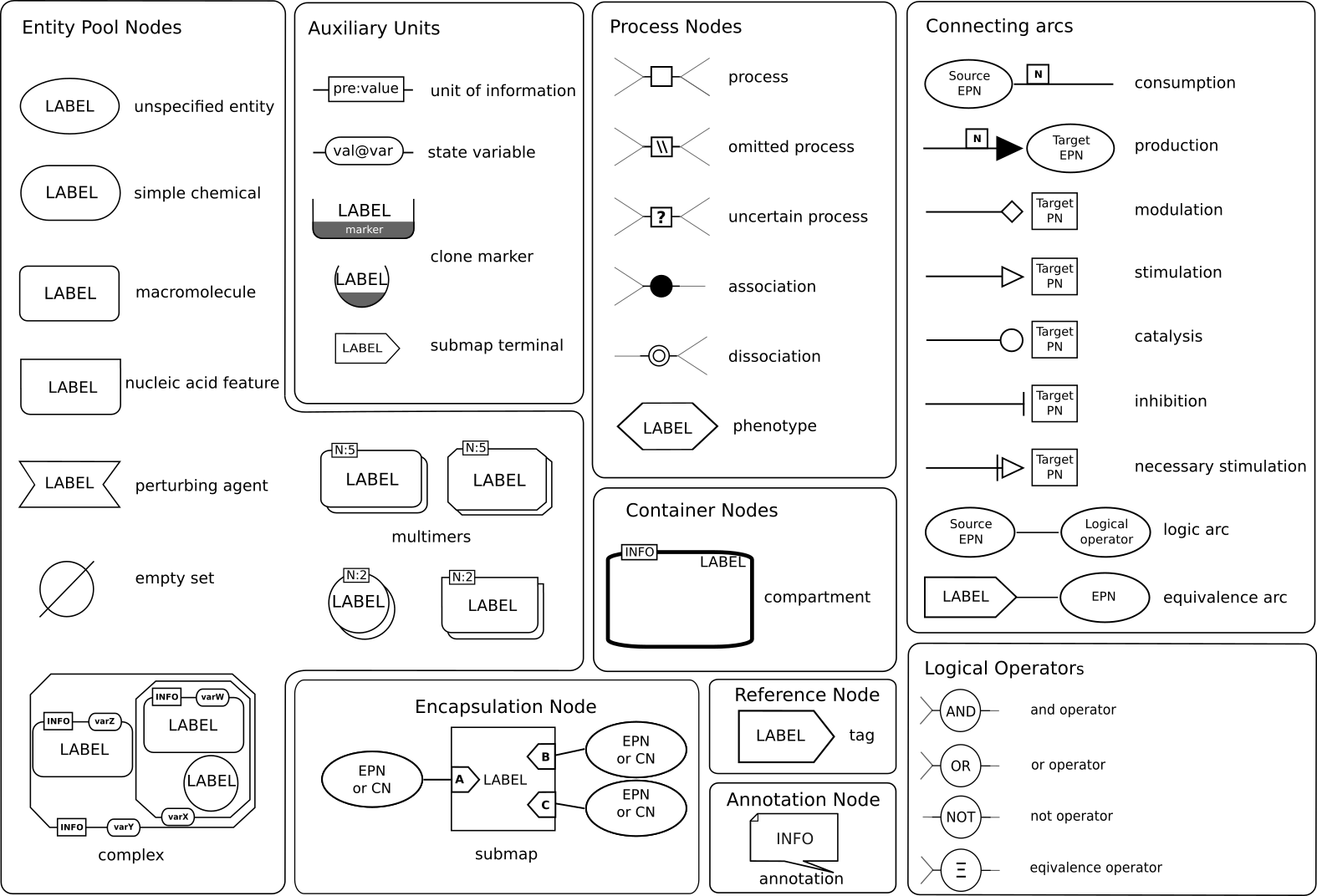 The Process Description language is made up of two different types of nodes (PDs are bipartite graphs) representing pools of physical entities ("continuants") and processes ("occurants", e.g., reactions. The arcs linking the nodes represent consumption, production, and modulation. Nodes can be adorned with states. This language allows a very detailed description of all the processes taking place in a system. However, it is subjected to combinatorial explosion. Process Descriptions are often used in most metabolic networks (e.g. Reactome, KEGG Pathways metabolic pathways, etc.). They are good graphical representations of process modelling, e.g. ODEs or stochastic processes. SBGN PD glyphs are summarised in the reference card: Also available in SVG